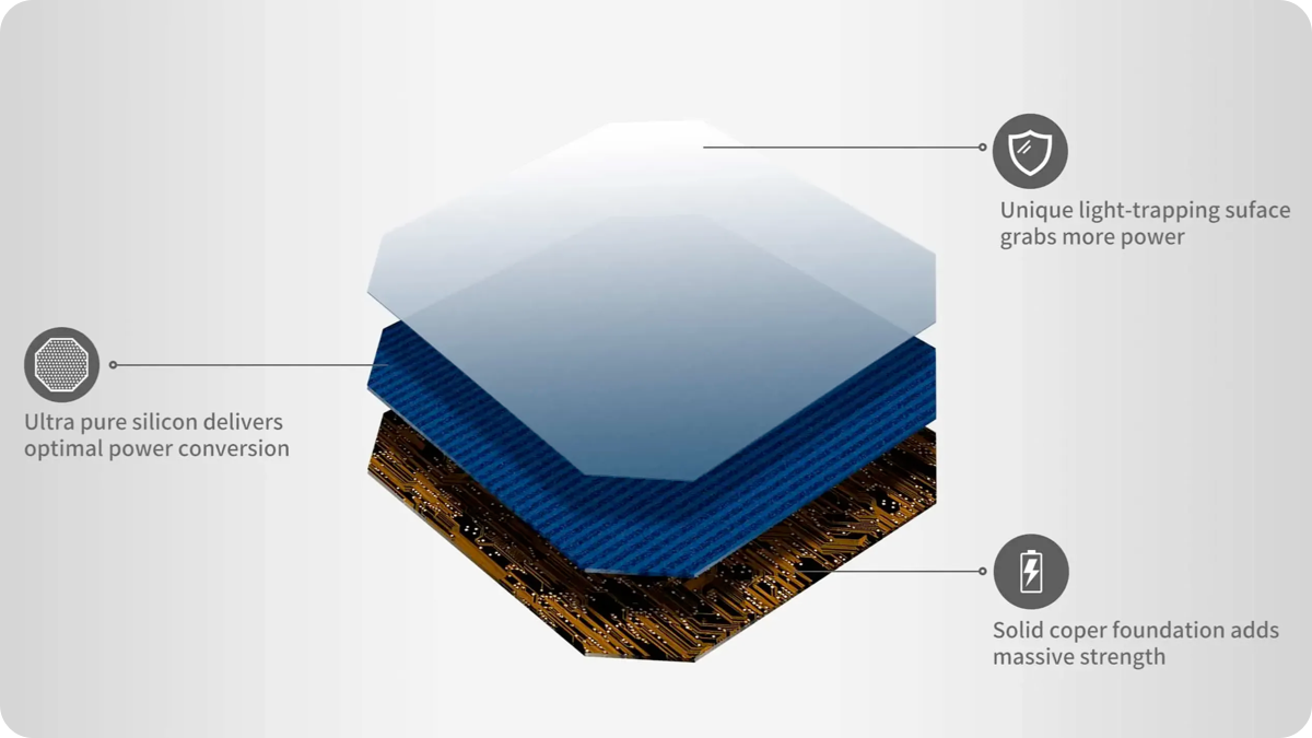 El diseño laminado de ETFE hace que el panel solar sea extremadamente resistente a la temperatura y la corrosión, con una temperatura de funcionamiento de -10 a 65 °C (14 a 149 °F). La rejilla de la batería está ubicada en la parte posterior del panel, evita grietas y prolonga la vida útil de la batería.