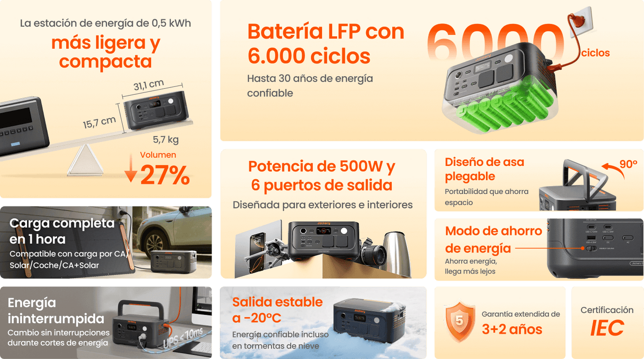 Con una capacidad de 512 Wh y una potencia de 500 W, el nuevo Jackery Explorer 500 v2 es perfecto para un fin de semana de camping o para mantener tus esenciales funcionando en caso de un corte de luz en casa. Ya sea para recargar tus teléfonos, encender tus lámparas o incluso poner en marcha una pequeña cafetera, siempre está a la altura. Con sus 2 tomas de corriente CA, 1 puerto para coche, 2 puertos USB-C y 1 puerto USB-A, puedes alimentar varios dispositivos al mismo tiempo - se acabó esperar turno para recargar.