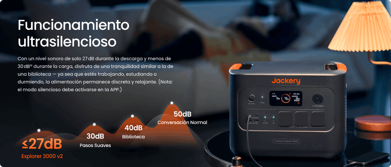 Nota 4: A una temperatura constante de 25 °C y con una carga del 20 %, el ruido de descarga del producto puede ser de tan solo 27 dB. Datos procedentes de Jackery Laboratories. Consulte los datos reales para mayor precisión.